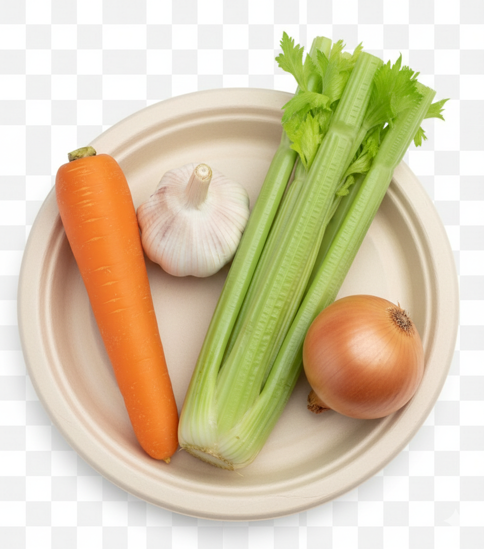רכיבים (משקל ממוצע): גזר 350 גרם, בצל יבש 400 גרם, ראש שום, סלרי אמריקאי. בסיס מושלם למרקים, ציר, בולונז, ותבשילים.