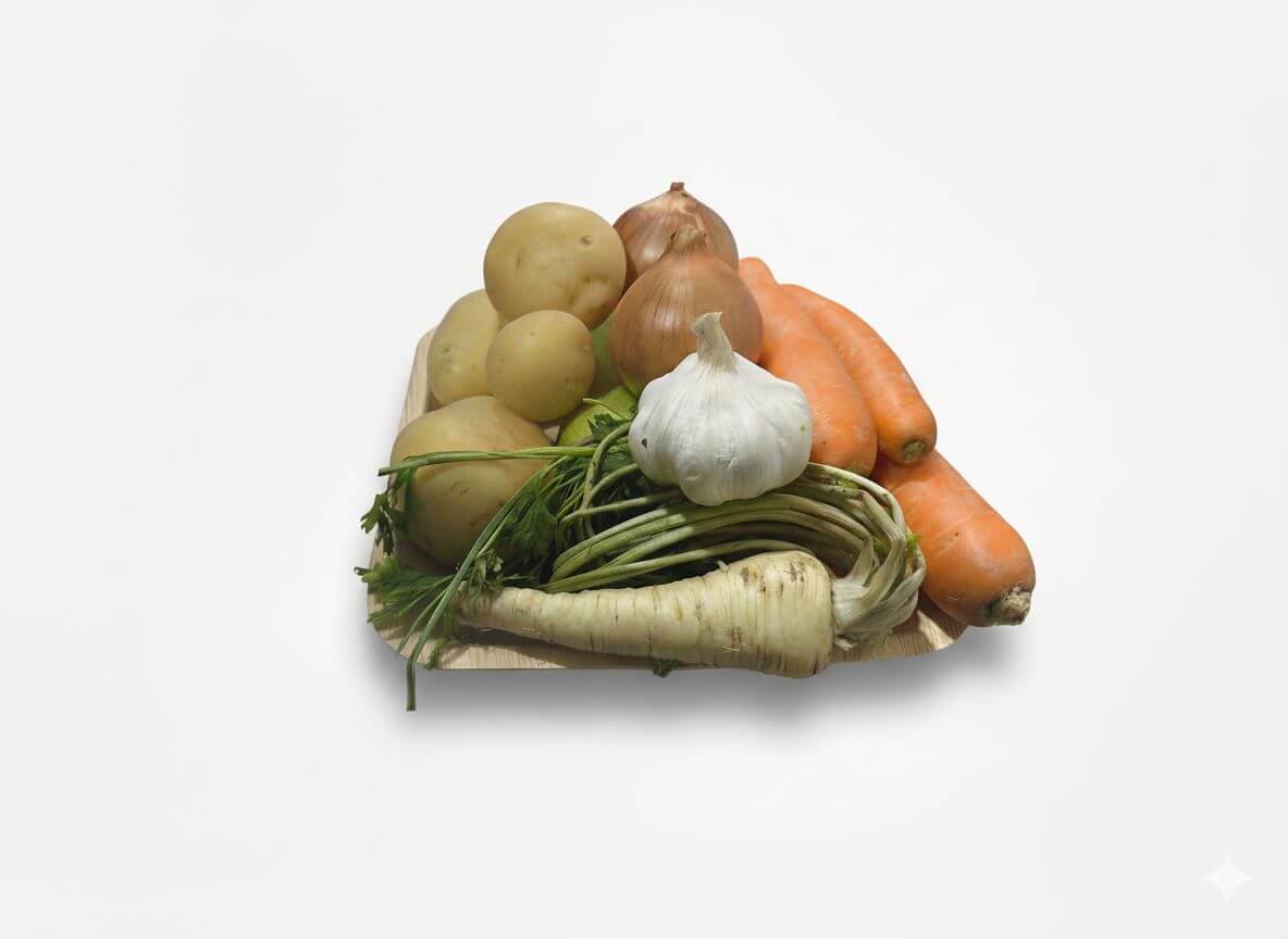רכיבים (משקל ממוצע): גזר 350 גרם, תפו״א 350 גרם, קישוא 300 גרם, בצל יבש 300 גרם, ראש שום, שורש פטרוזיליה